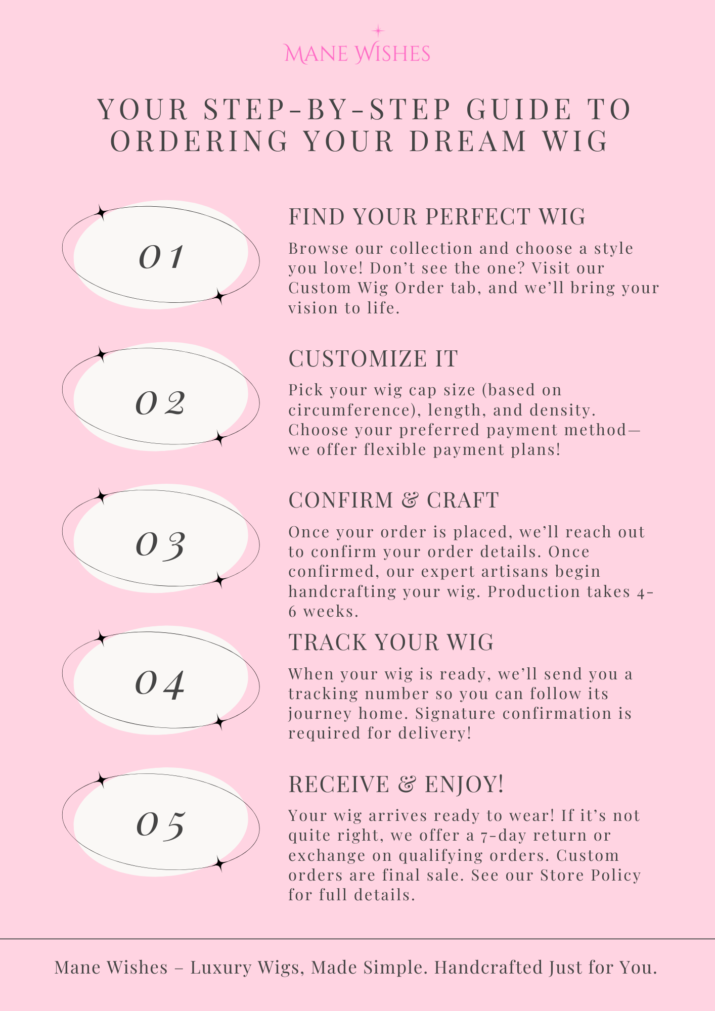 At Mane Wishes, we take pride in crafting luxury handmade wigs tailored to your specifications. If you place an order for a made-to-order or custom wig and we do not have the specific materials required to fulfill your request: